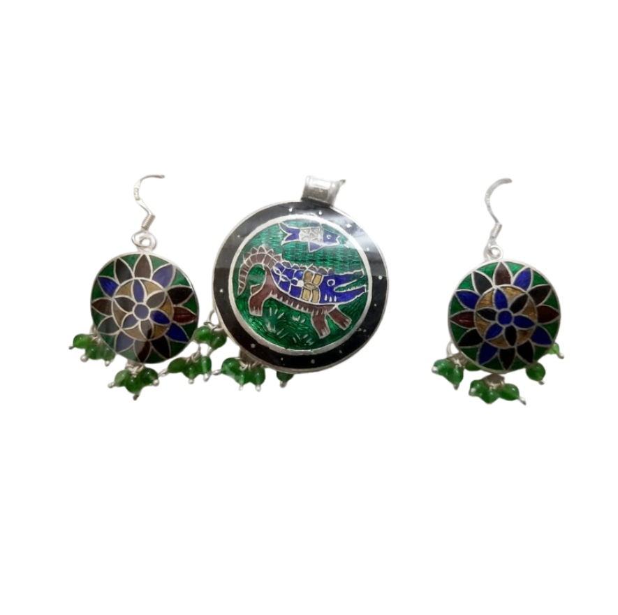 Make a statement with this distinctive Meenakari pendant set, featuring an eye-catching design of an alligator and a fish in a vibrant green and blue palette. The central pendant is framed by a sleek black border, while the accompanying round earrings display a captivating floral motif in rich greens, blues, and browns. This silver set, weighing 19 grams, is enhanced with delicate green bead drops, offering a bold yet elegant addition to your jewelry collection.