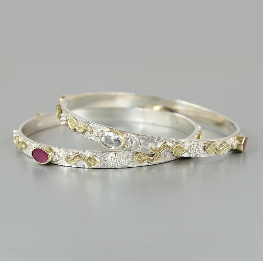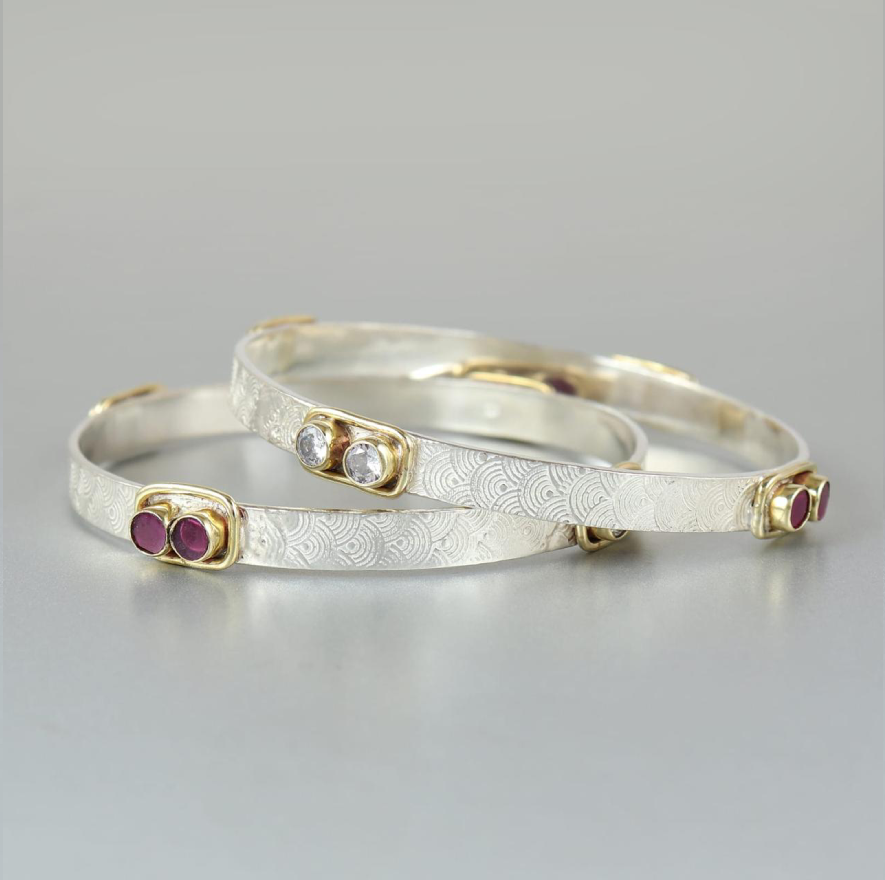 Textured Silver Bangle with Gold Accents & Ruby Gemstones