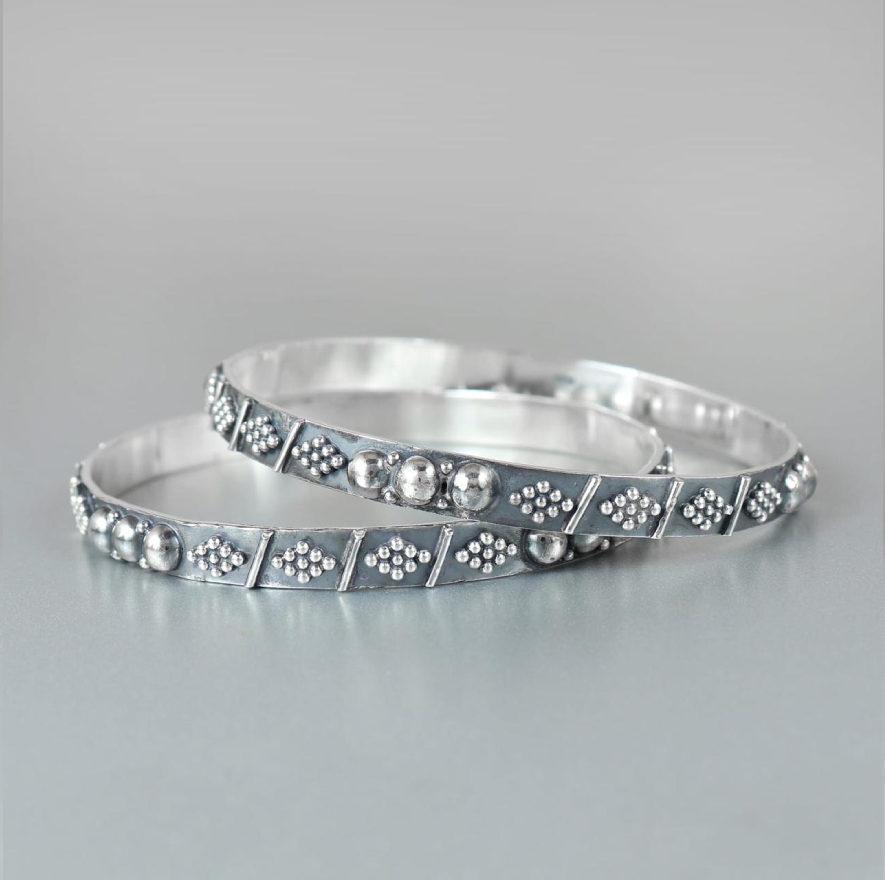 Discover the subtle elegance of this pair of sterling silver bangles. Each bangle features a distinct textured surface adorned with patterns of raised silver dots and small etched linear details. The varying sizes and arrangements of these silver embellishments create a visually interesting and tactile design. These classic silver bangles offer a versatile and understated sophistication, perfect for everyday wear or for layering with other bracelets.