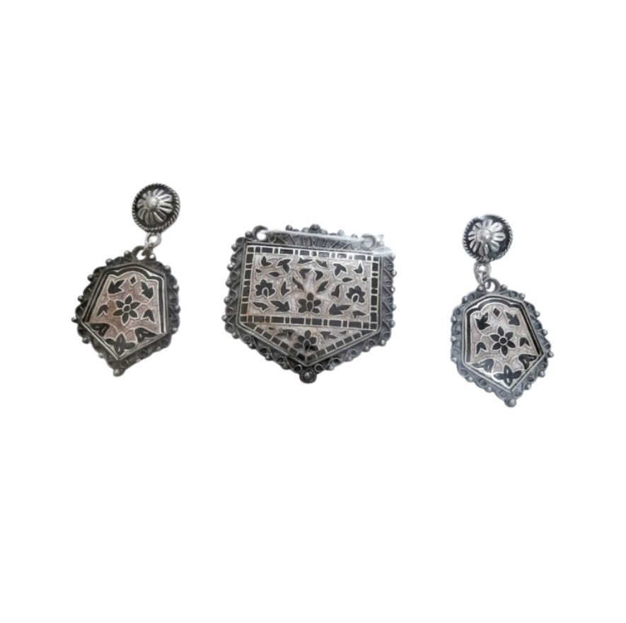 A beautiful oxidized silver pendant set with a rectangular pendant and hexagonal earrings. Both pieces feature an intricate black and silver floral pattern, offering a unique vintage aesthetic. The set weighs 33 grams.