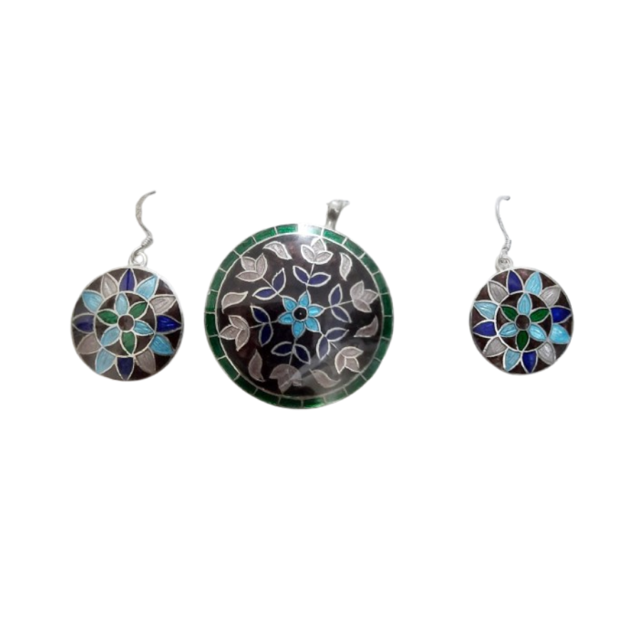 This charming silver pendant set features a circular pendant with a black background, adorned with a central floral motif surrounded by blue and green leaves. The matching round earrings echo the same colorful floral design. The entire set weighs 15 grams, offering a lively addition to your jewelry collection.
