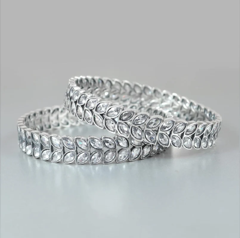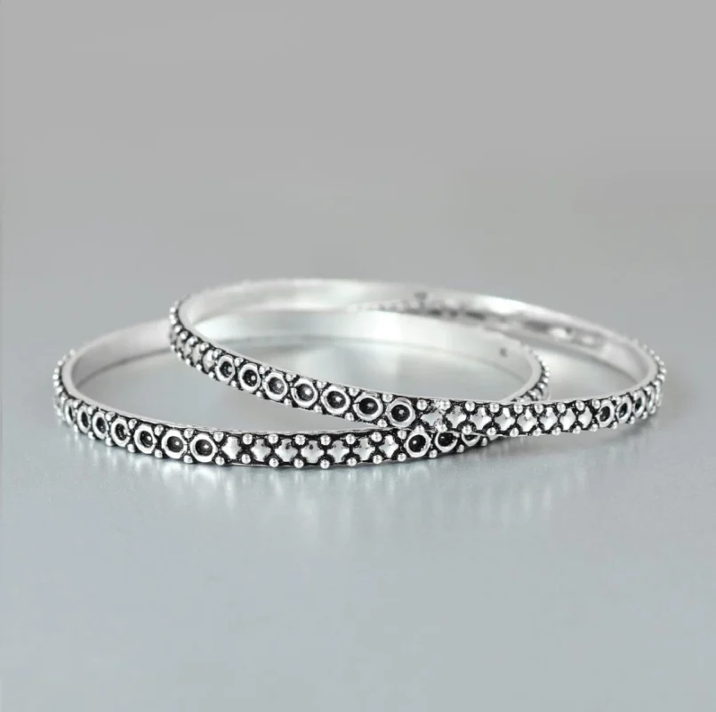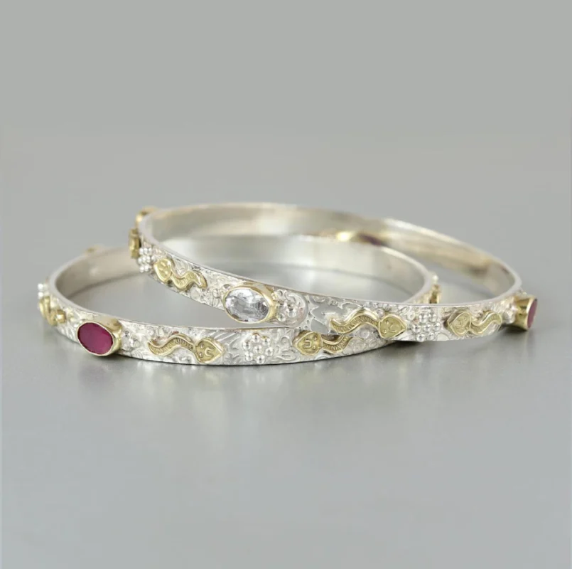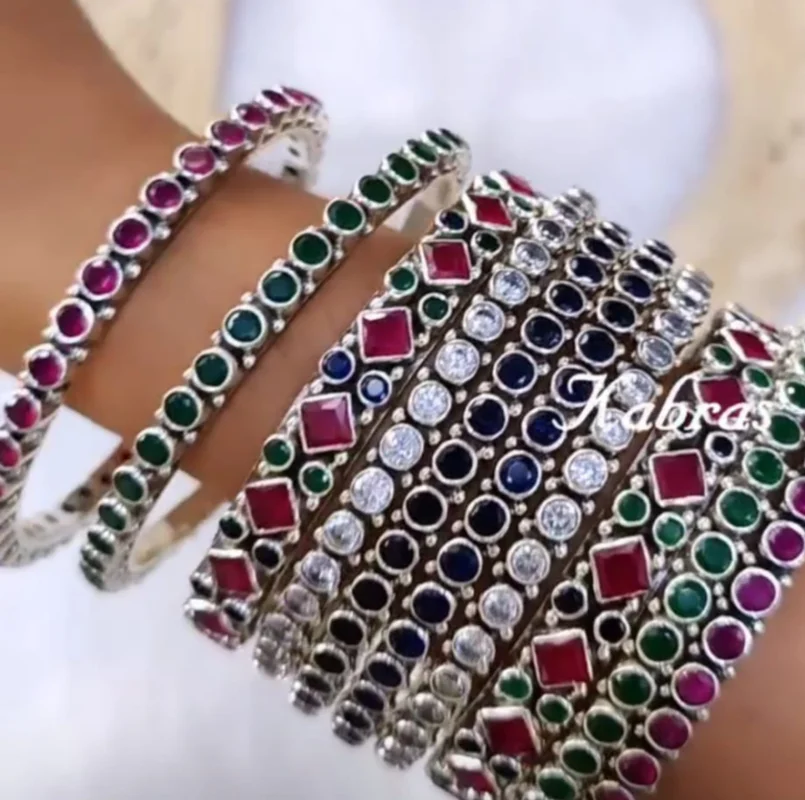 Discover a stunning collection of ladies’ bangles, crafted from sterling silver and adorned with various colorful gemstones and intricate designs. This assortment (Size 2.4) features a diverse range of styles, from elegant gemstone-studded patterns to sophisticated plain silver options, perfect for mixing, matching, and elevating any ethnic or contemporary ensemble. Each bangle is designed to add a touch of grace and sparkle to your wrist.