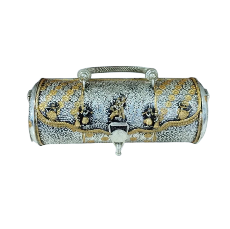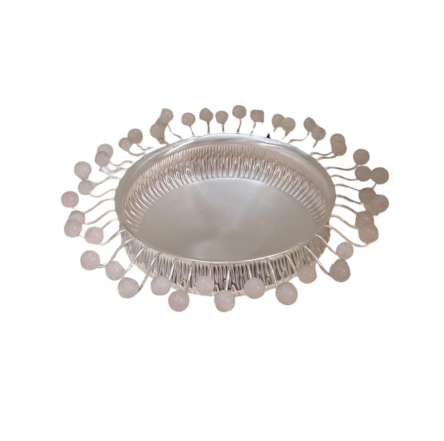 A striking silver bowl surrounded by white stone orbs, designed like rays of purity. The circular arrangement symbolizes completeness and divine balance. Its polished silver surface reflects elegance and refinement. Perfect for modern homes with a touch of tradition. Inspired by Indian aesthetics of balance and sacred geometry. A unique piece that bridges tradition and contemporary art.
