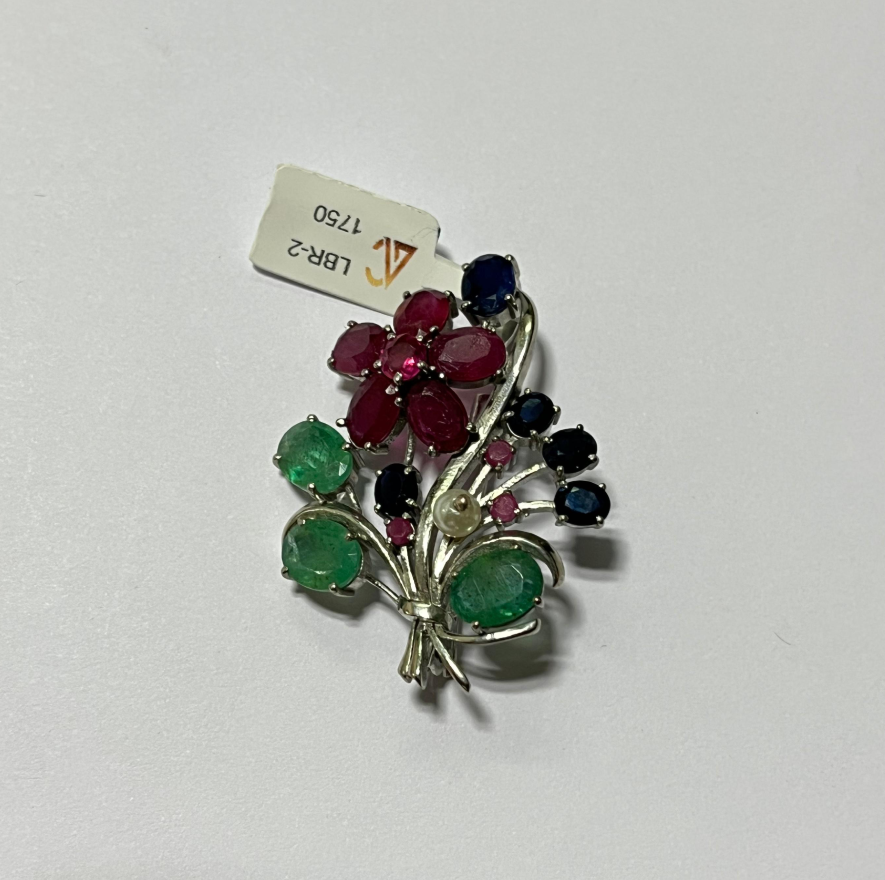 Adorn your attire with this charming sterling silver brooch, designed as a beautiful floral bouquet. This captivating piece features an array of natural gemstones, including rich red rubies forming flowers, vibrant green emeralds as leaves, and deep blue sapphires adding delightful accents. A small pearl detail completes this intricate and colorful design, perfect for adding a touch of elegance and whimsy to any outfit.