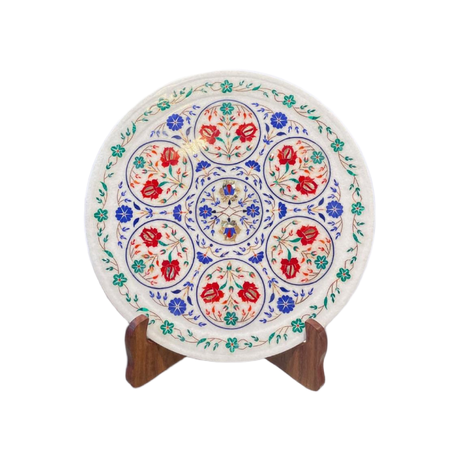 Elevate your home decor with this exquisite hand-inlaid marble plate, a true testament to traditional Indian craftsmanship. It features a captivating design of multiple circular floral patterns, meticulously created with vibrant red, blue, and green semi-precious stones. Perfect as a stunning centerpiece, a unique wall hanging, or a thoughtful gift, this piece showcases intricate artistry and adds a touch of heritage and elegance.